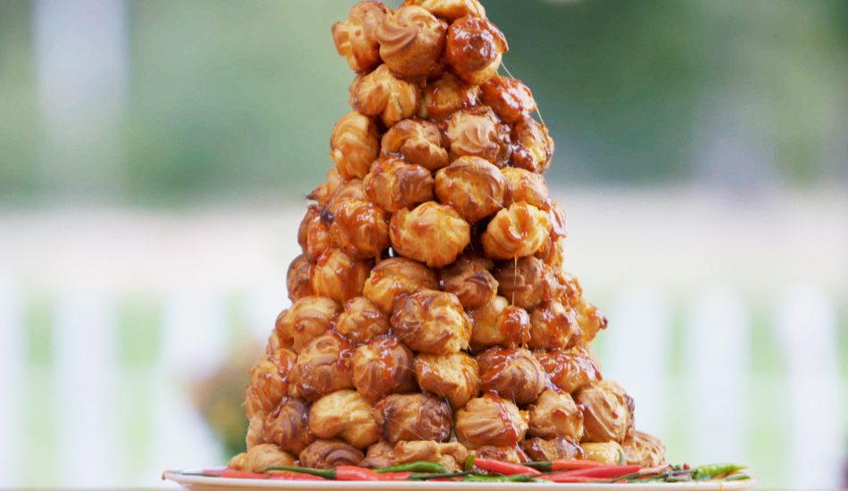 - Dip de soezen in de stroop en maak hiermee een ring van de soezen. Bouw hierop verder tot een toren.