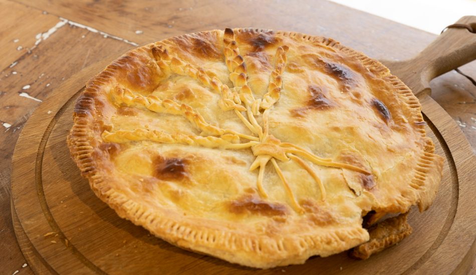 - Versier de bovenkant van de pie met het overgebleven deeg.