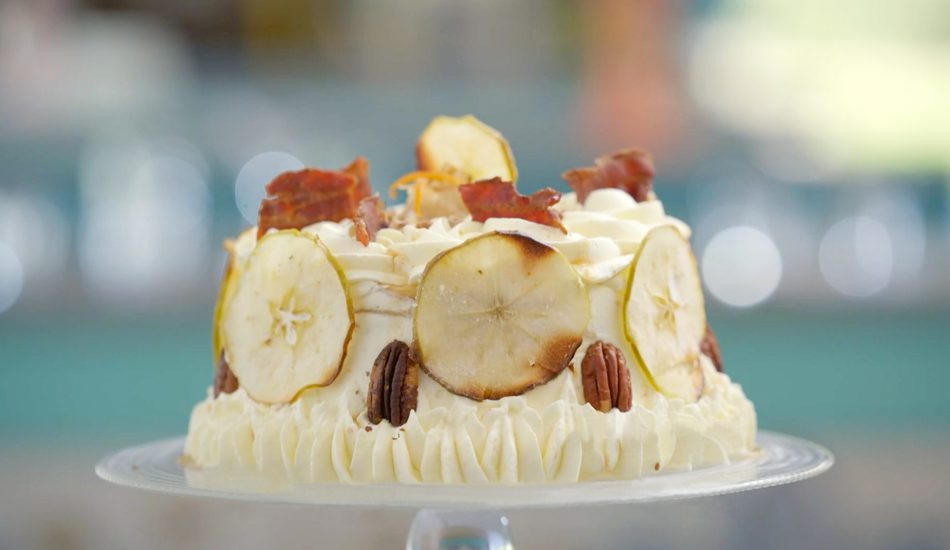 - Garneer het geheel met pecannootjes en gekarameliseerde spekreepjes.