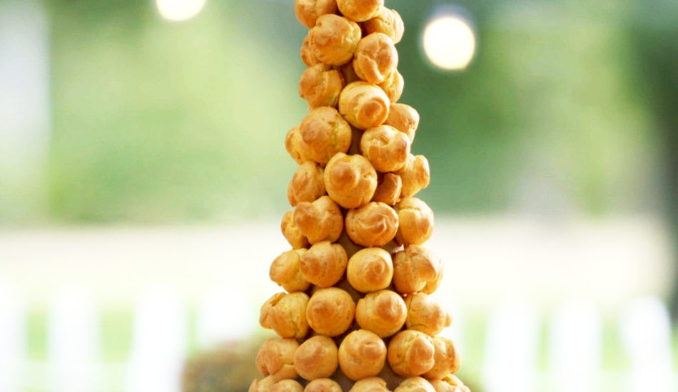 - Wanneer de soezen uit de oven zijn, ze af laten koelen. De helft van de soezen vullen met de zalm-vulling, de andere helft met de prosciutto vulling. Bouw hier een toren van. Het basis mengsel gebruiken als evt. lijm.