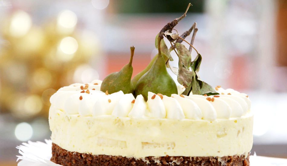 - Verdeel de stukken peer in de taartring en volg met de advocaat.