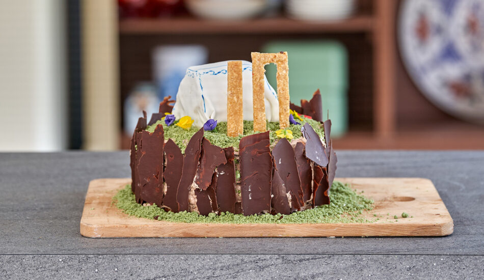 • Strooi het pistache-chocoladegras over de bovenkant van de taart en om de tent.
