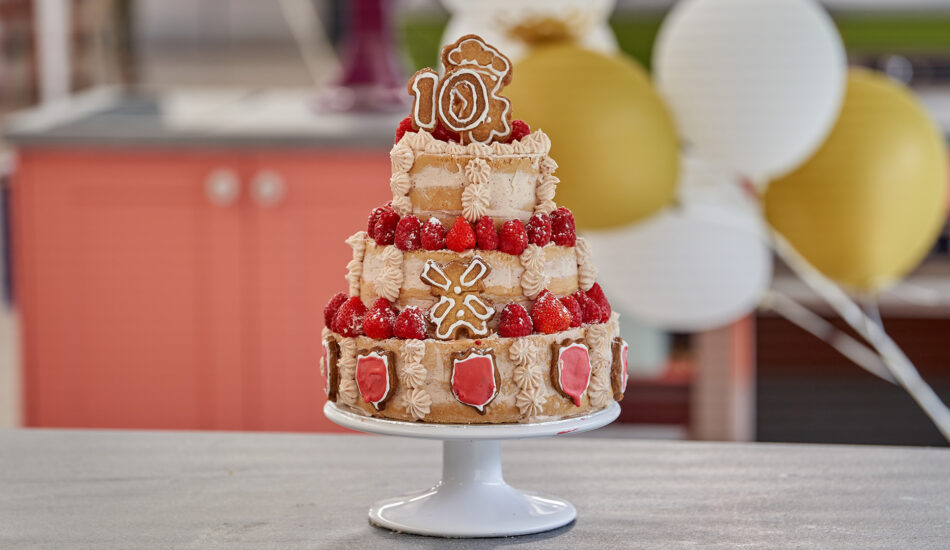- Plaats het cijfer 10 en het bakkertje bovenop de taart.