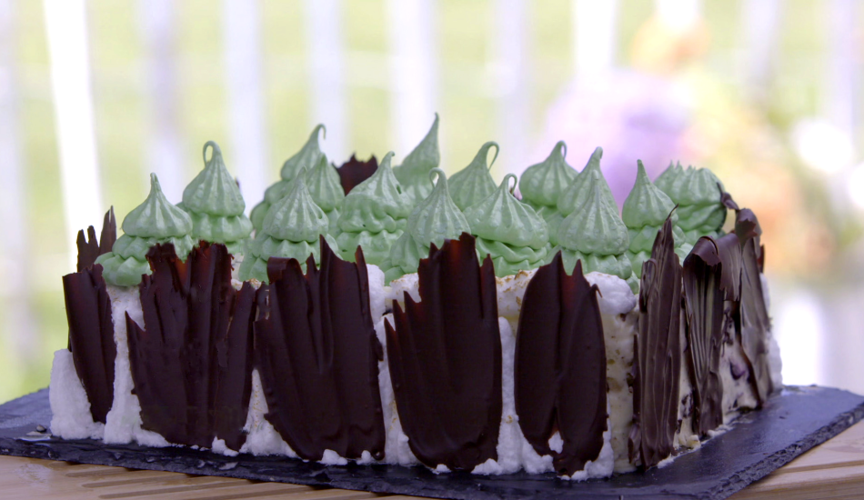 - Werk de zijkant af met de meringue en zet hierin de chocoladeschotsen