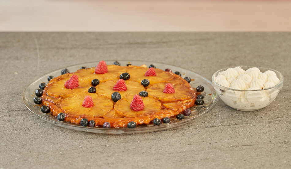 - Giet de ananas-gembersiroop over de tarte tatin.
