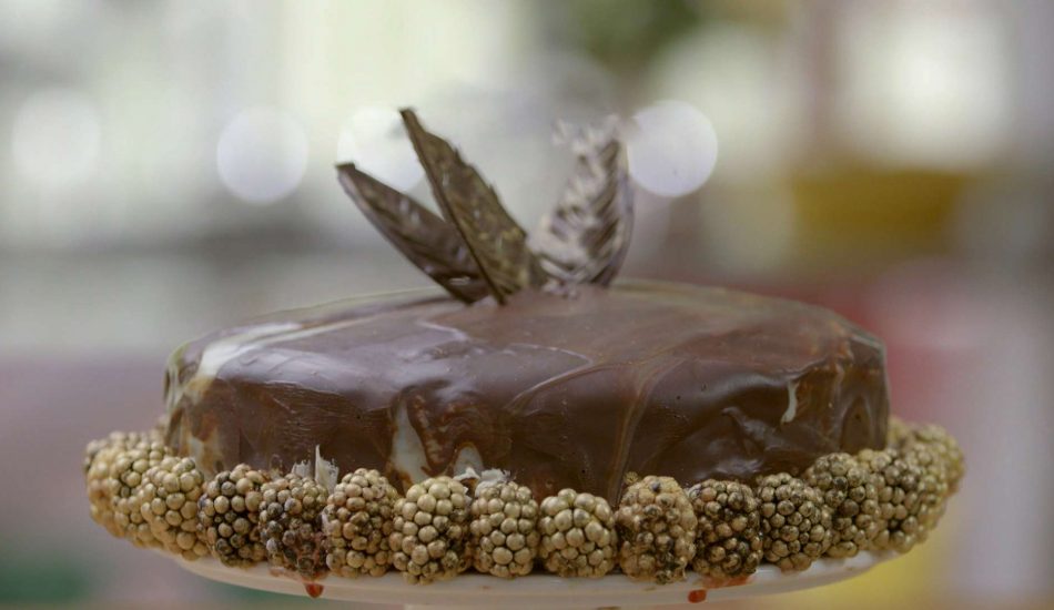- Garneer de taart met de chocoladebladen en de met goudpoeder ‘vergulde’ bramen.