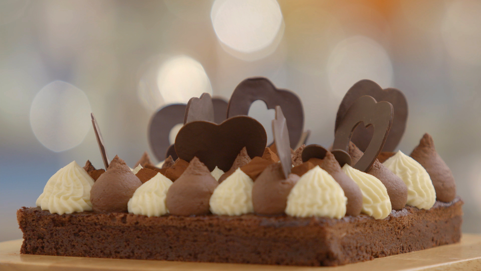 - De plak truffel op de biscuits leggen. De verschillende ganaches om en om in toefjes (dambordpatroon) op de truffel spuiten. In het midden een rijtje met chocolade harten steken. Presenteren op een houten plank.