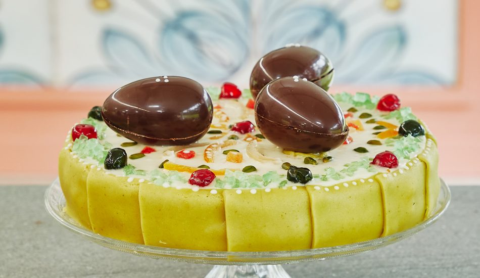 - Zet 3 paasei helften op de taart. Doe in elk ei een marsepeinen kuikentje en maak de paaseieren dicht met de andere helft.