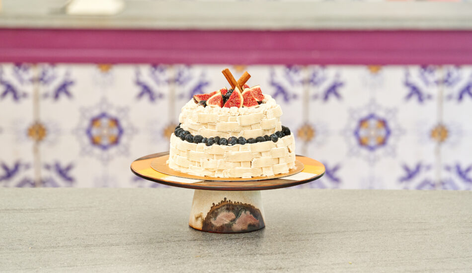 • Spuit op de buitenkant van de cake een mandpatroon met botercrème.