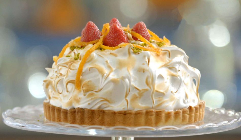 - Brand de rand af met de brander. Leg hier ten slotte nog wat stukjes gekonfijte sinaasappel omheen.