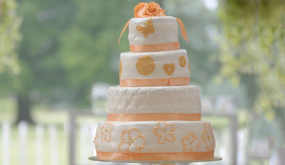 - Kneed de sugar lace tot het zacht is en strijk uit over de mal. Laat 4 minuten drogen en haal de decoratie voorzichtig uit de vorm. (Sugar lace kan vervangen worden door fondantversieringen.)