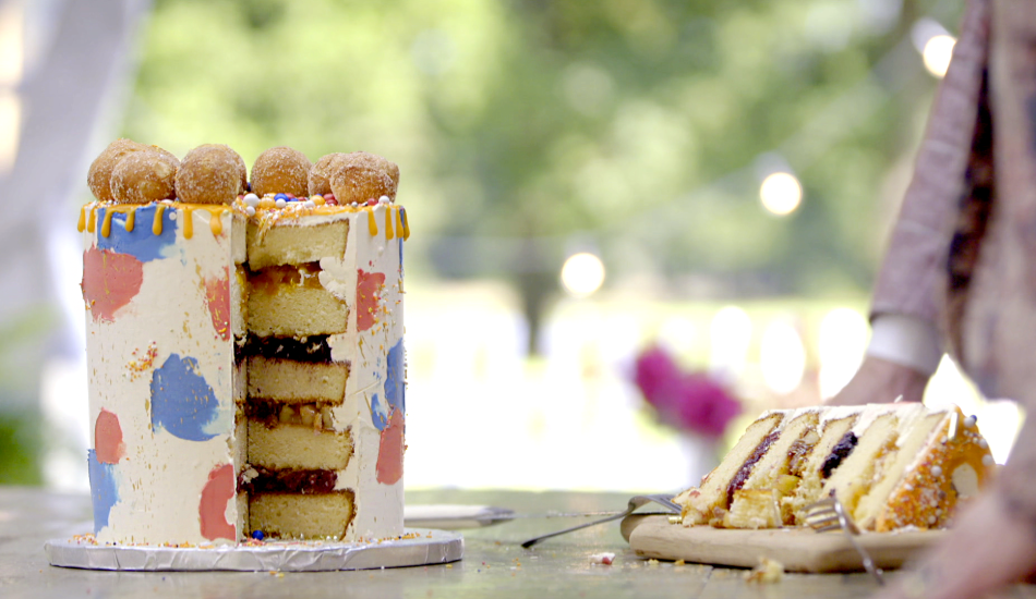 De Limburgse Pauline is dol op het bakken van vlaai, daarom heeft ze voor dit streekproducten-spektakelstuk diverse vlaaivullingen gecombineerd in deze strak afgewerkte taart. Tijdens carnaval eten ze in Limburg Nonnevotten, een soort donuts. Daarmee garneert ze de taart.