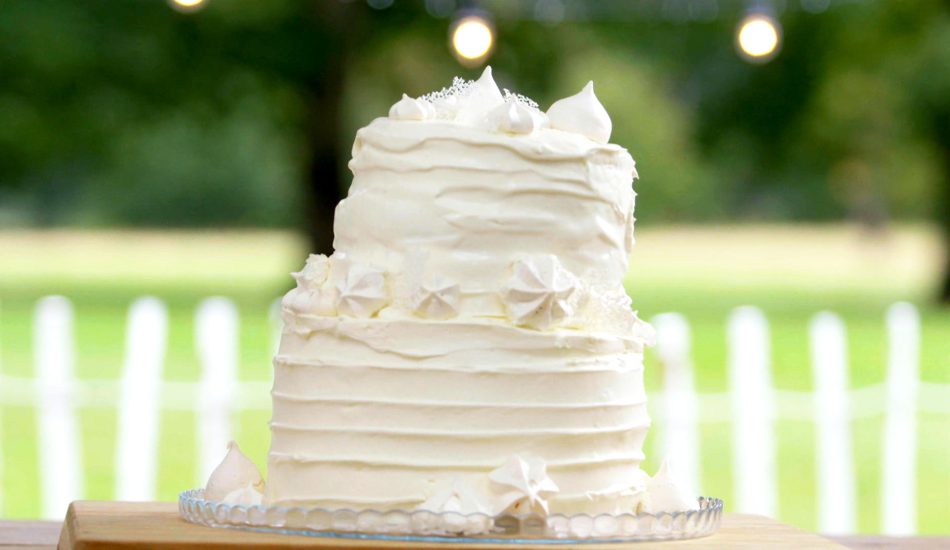 - Smeer de taart af met de frosting en decoreer met de chocoschotsen en de meringuetoefjes.