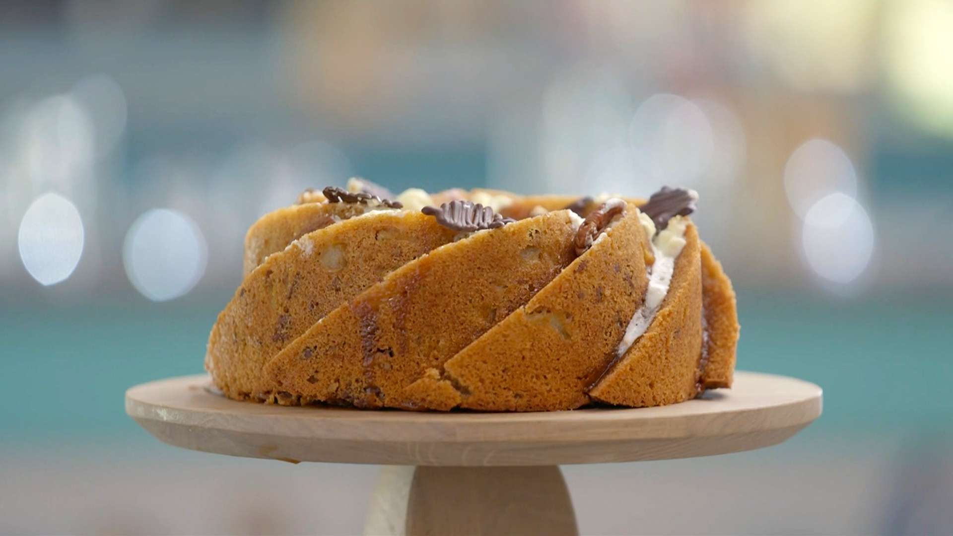 • Laat de cake 15 minuten afkoelen in de vorm en stort hem dan voorzichtig op een rooster om verder af te laten koelen.
