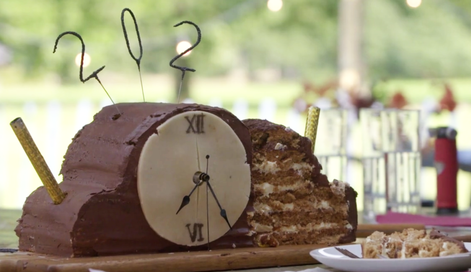 - Snijd aan de voorkant van de cake een ruimte uit voor het uurwerk. Maak het uurwerk gereed en verpak het in huishoudfolie