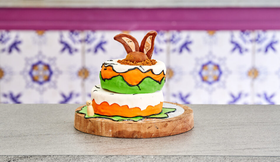 Van buiten geeft deze cartoon cake al een behoorlijke hint over wat je aan de binnenkant kan verwachten: een heerlijke worteltaart!
