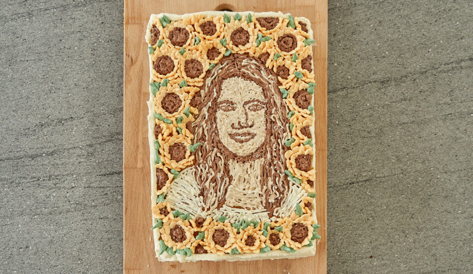 Deze yellow velvet-cake is een fleurrijk kunstwerk. Versiert met een portret van decoratiebeslag en gevuld met frisse smaken. Volgens Janny is de smaak mals en zacht. Dat klinkt alleen al heerlijk.