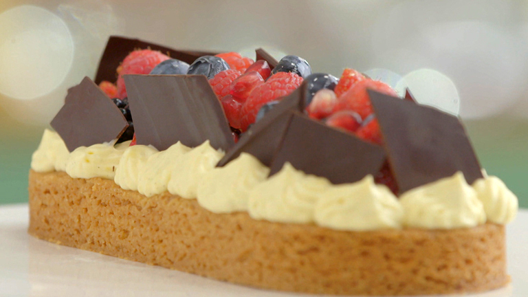 - Haal het fruit door de abrikozenjam en leg op de banketbakkersroom.