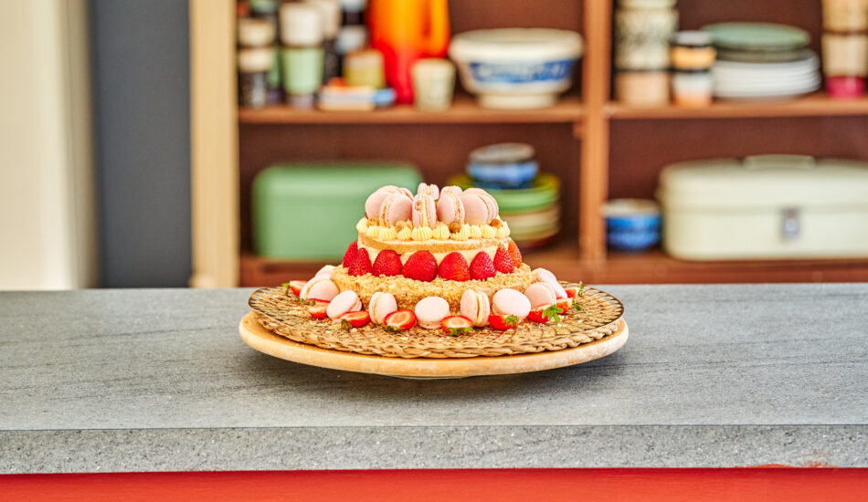 • Decoreer de taart met toefje citroenbotercrème, macarons en de gehalveerde aardbeien met het kroontje er nog aan.