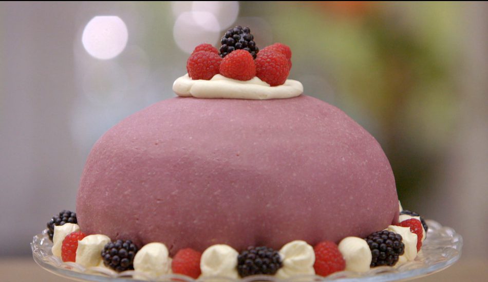 - Verwijder de bolvorm en het plastic en smeer de taart in met swiss merengue botercrème.